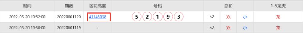 在下一个开奖时间后,最快收到的特定区块高度,将使用它的哈希值作为开奖结果。